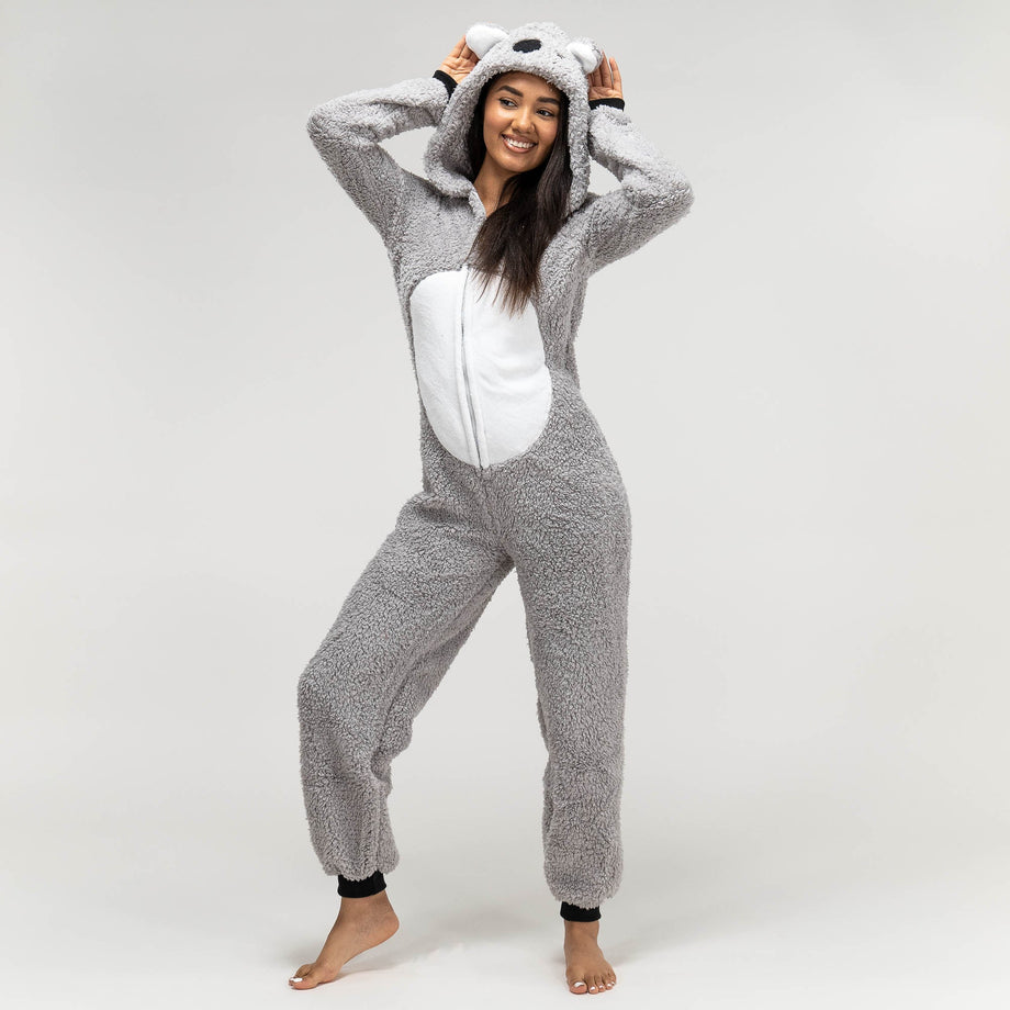 Dámsky zvierací flísový overal Onesie s kapucňou Medvedík koala, veľkosť: S-XL, Šedá / Biela– bigberthaoriginalslovakia