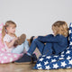 Tento rozkošný detský sedací vak s potlačou má mäkký semišový povrch a je očarujúci a pohodlný na relax. Tkanina má povrchovú úpravu odolnú voči škvrnám v prípade rozliatia tekutín a na zapínanie má bezpečnostný zips, ktorý zabraňuje prístupu detí k výplni.