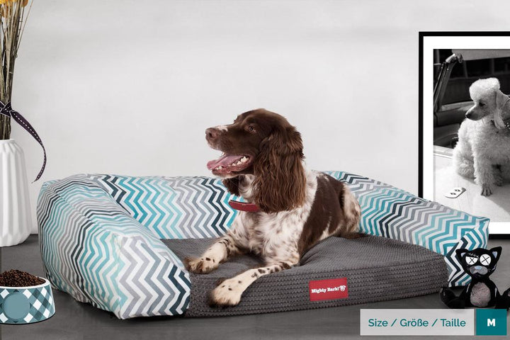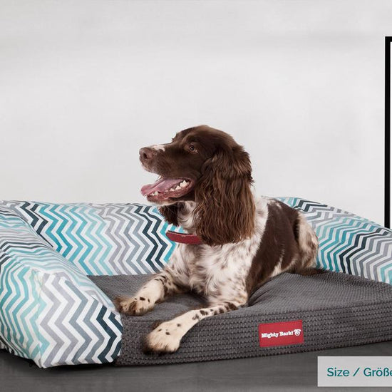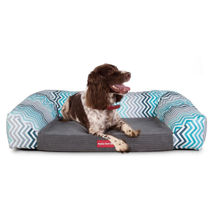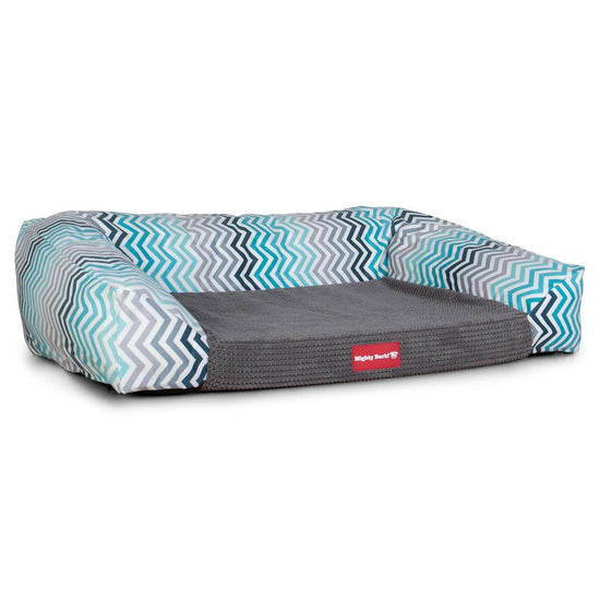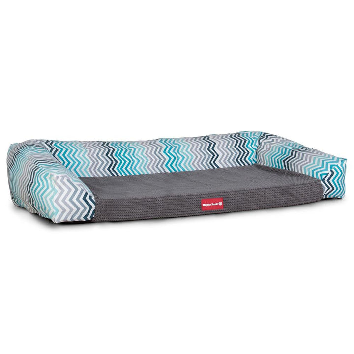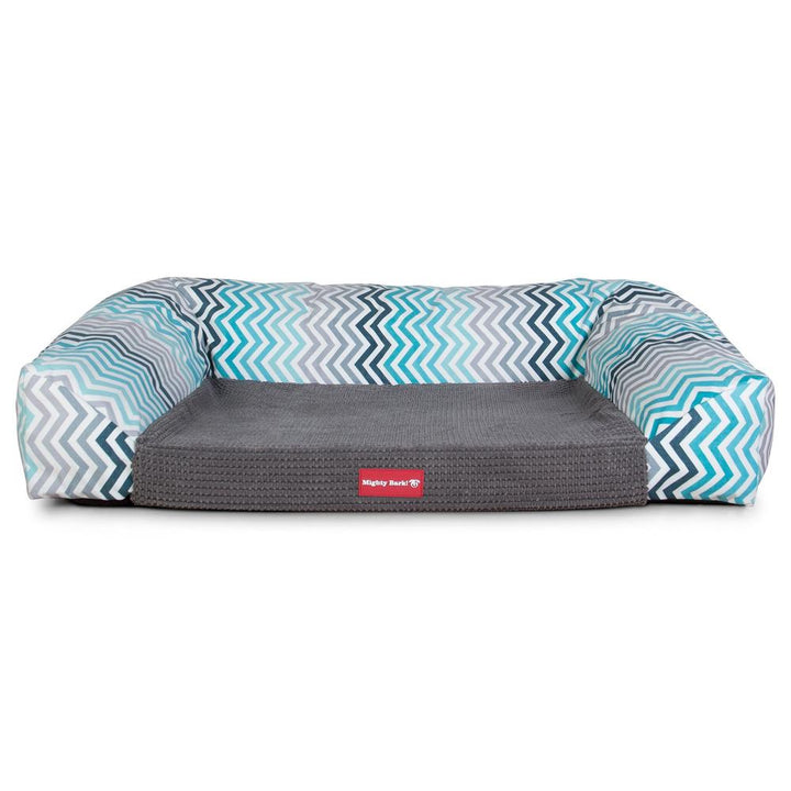 Mighty Bark "Pohovka" Pelech pre psa pohovka, lôžko pre psa z ortopedickej pamäťovej peny, Stredná, Veľká, XXL Geo potlač Krokva Modrozelená– bigberthaoriginalslovakia